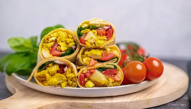 - Take one tortilla wrap at a time and fill it with potatoes, scrambled tofu, tomatoes, baby spinach, red onion, hot sauce, and fresh herbs as desired.4 piece tortilla wraps, 2 piece medium tomatoes, 80 g baby spinach, 1 piece red onion