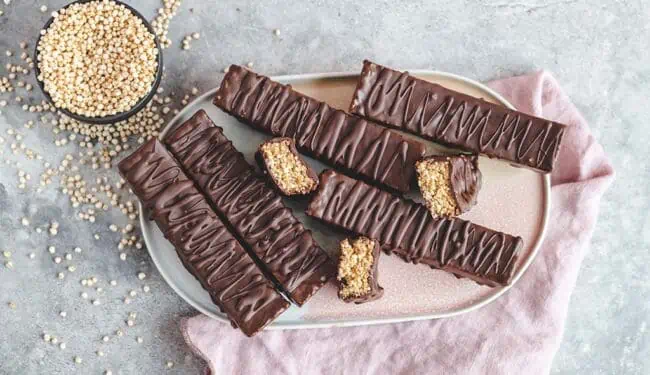 - Coat individually with the chocolate and place on a draining rack. Repeat until all bars are coated.180 g dark vegan chocolate