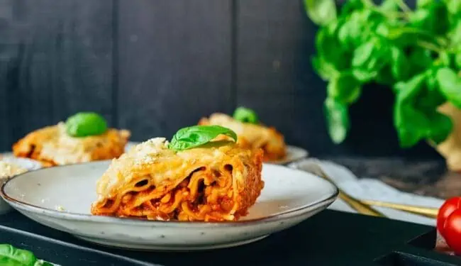- Remove from oven and let cool and set for 10-15 minutes. This step is important, otherwise everything can come apart. Cut into pieces and serve with a side salad, vegan parmesan, olive oil and basil.Mixed salad, Vegan parmesan, Fresh basil