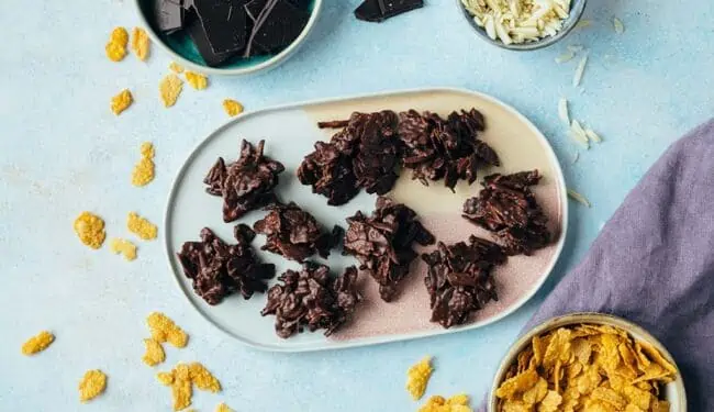 With this recipe, it is true that a good chocolate is half the battle. I’ve linked you my favorite brand below (unpaid). Otherwise, the recipe is really very simple and requires only three ingredients, cornflakes, chocolate and almond slivers. If you do not have almonds at home, you can simply omit them. In general, everything is allowed in the selection of chocolate.
