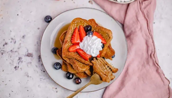 Vegan French toast is not only delicious, but also a great way to use up leftover bread and give it new life. You can use stale or dry bread or toast and dip it in the delicious mixture of vegetable milk and spices.
