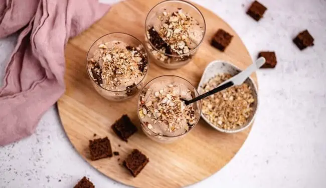 Let’s take a look at the preparation steps. First, I bake a sponge cake base and prepare a hazelnut cashew cream. Then only hazelnuts are missing, which I chop finely and roast in a pan. Finally, everything is neatly piled into dessert glasses and our delicious dessert is ready.