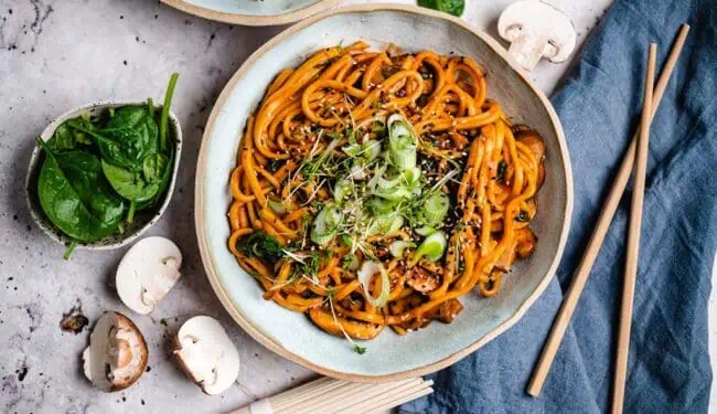Vegan Korean noodles are simply a dream! why? Because they are so quick and easy to make and bring a great flavor note. I love these simple dishes that are on the table in no time. You don’t always feel like cooking for a long time or there’s just not much left in the fridge. Exactly then you need a simple, quick and uncomplicated dish. Korean cuisine is super versatile and full of flavors and that’s where we want to get into today. Are you ready? Then let’s get started together.