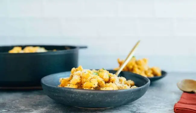 - Sprinkle over the mac and cheese in the baking dish and place in the oven.