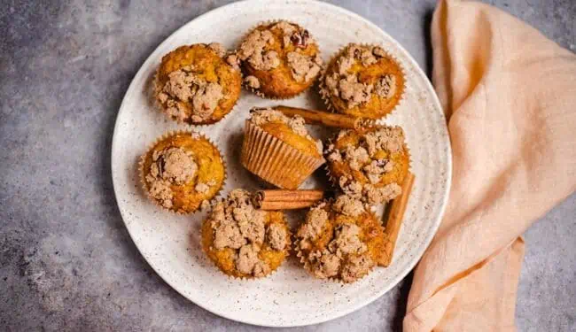 - Wash out the baking bowl for a short time and add all the ingredients for the sprinkles. Mix with your fingers until everything is well connected and spread the sprinkles evenly over the muffins. Turn into the oven and bake for 30 minutes. Bake with the steam cooker at 165 degrees for 35 minutes.45 ml Frying and baking oil, 40 g fine spelt flour or gluten-free flour mix, 17 g Oatmeal, 24 g Walnuts, 1 tbspn Cinnamon, 1 ½ tbspn Cane sugar or another sugar, Optional: 1/2 tsp ground ginger