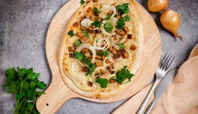 - Spread evenly on tarte flambée bases. Spread onion rings and smoked tofu on top and sprinkle more parsley if desired.2 Piece white onion, 200 g Smoked tofu