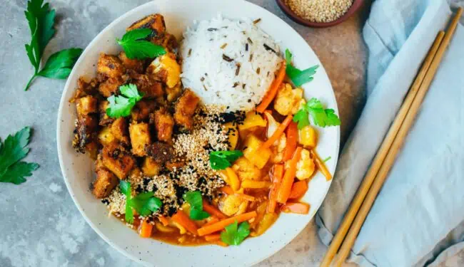 What must not be missing in any case? Basmati rice and a portion of vegetable protein and we get that from tofu, for example. Crispy Tofu ? The definitely goes great with this dish, alternatively chickpeas, tempeh or another vegan protein source will work as well.