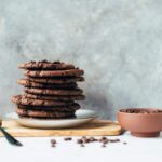Mit den Händen und einem Löffel 18 gleichmäßige Portionen abtrennen. Zu Kugeln formen und einmal im vorbereiteten Überzug wälzen. Auf das Backblech legen, plattdrücken und zu Cookies formen. Mit Schoko Drops nach Belieben verzieren.