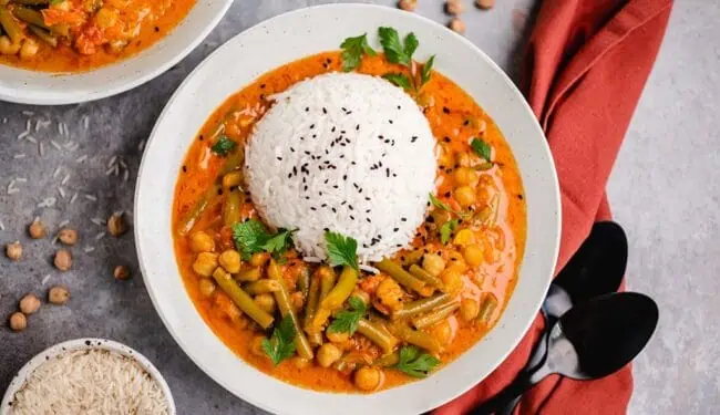 - Provide a large pot and heat. Add a tablespoon of coconut milk (the solid part) to the pot. Add onion, garlic and yellow curry paste and stir-fry. Add green beans, chickpeas, tomato pieces and cumin and continue stirring. Deglaze with remaining coconut milk, stir, cover and simmer for 20 minutes.400 ml Coconut milk, 60 g red onion, 3 Garlic cloves, 30 g Thai curry paste, 200 g green beans, 400 g Chickpeas, 400 g Tomato pieces, 1 tbspn Cumin